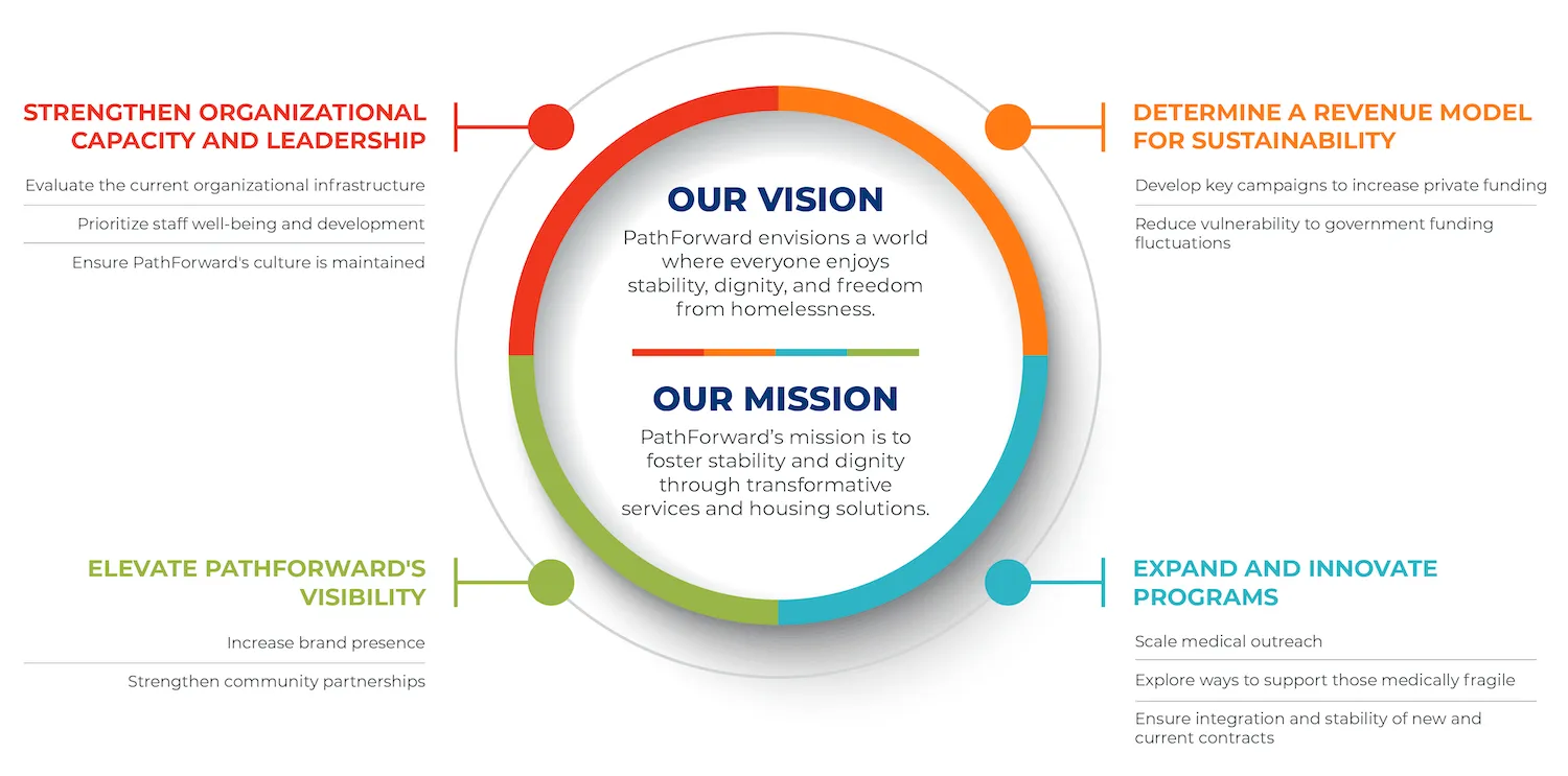 PathForward’s Strategic Plan, developed by our Board of Directors, serves as a vital roadmap to guide our mission-driven work, ensuring we continue to create lasting solutions for adults experiencing homelessness. Throughout this strategic planning period, PathForward will continue to develop innovative programs that help move clients from the streets to stability, strength the infrastructure needed for long-term sustainability, and establish a sustainable revenue model to support and expand our impact.